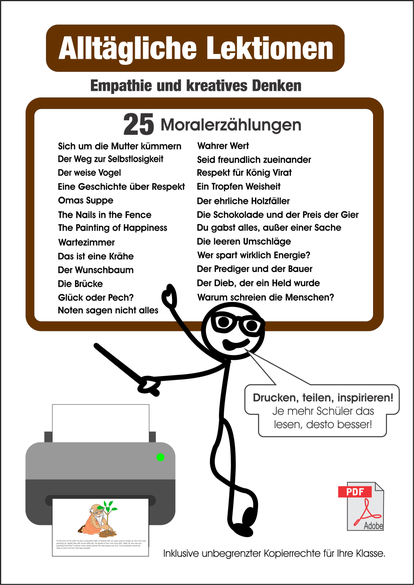 25 Geschichten, die zum Nachdenken anregen. Mit diesem Heft voller kurzer Geschichten mit einer Moral verleihen Sie Ihrem Unterricht mehr Tiefe. Lesen Sie Ihren Schülern regelmäßig eine schöne Geschichte vor und geben Sie ihnen damit einen wertvollen Denkanstoß mit auf den Weg. Die Moralerzählungen sind kurz und prägnant und eignen sich auch hervorragend, um mit den Schülern ins Gespräch zu kommen – über Werte, Empathie und kreatives Denken. In einer Zeit voller digitaler Kommunikation schafft eine solche „Face-to-Face“-Geschichte echte Verbindung und ein ehrliches Gespräch im Klassenraum.