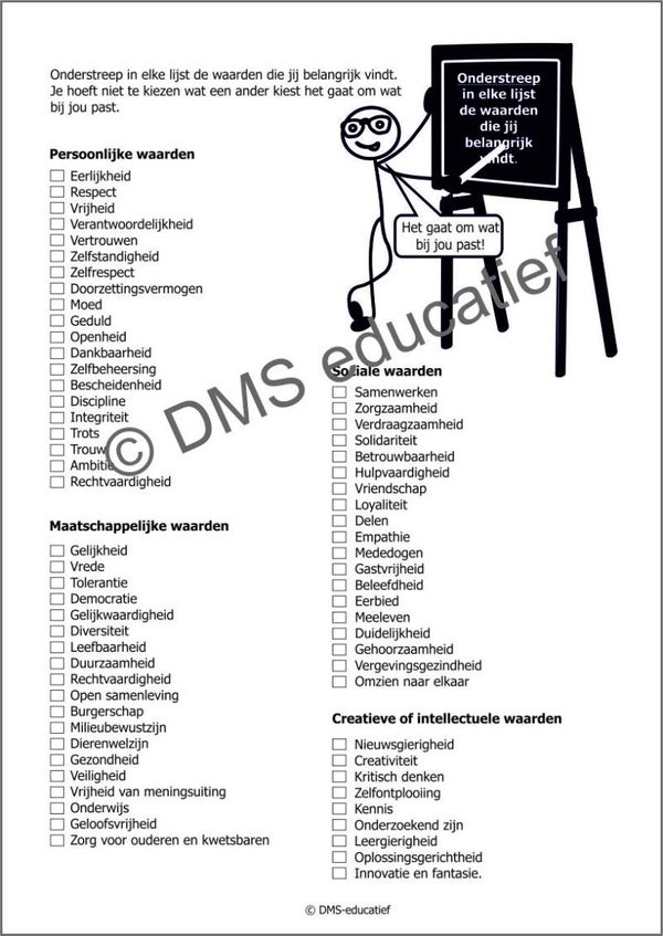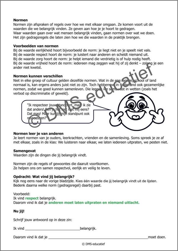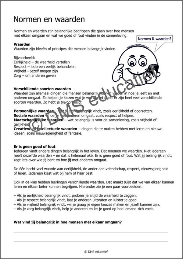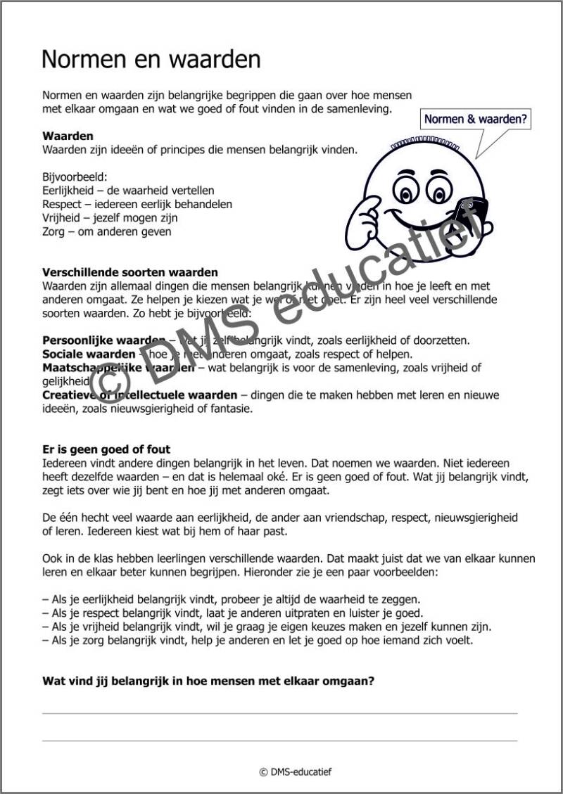 De leerlingen ontdekken wat waarden zijn – zoals respect, eerlijkheid of vrijheid – en welke normen daarbij horen. Ze denken na over hun eigen gedrag, zowel online als offline.