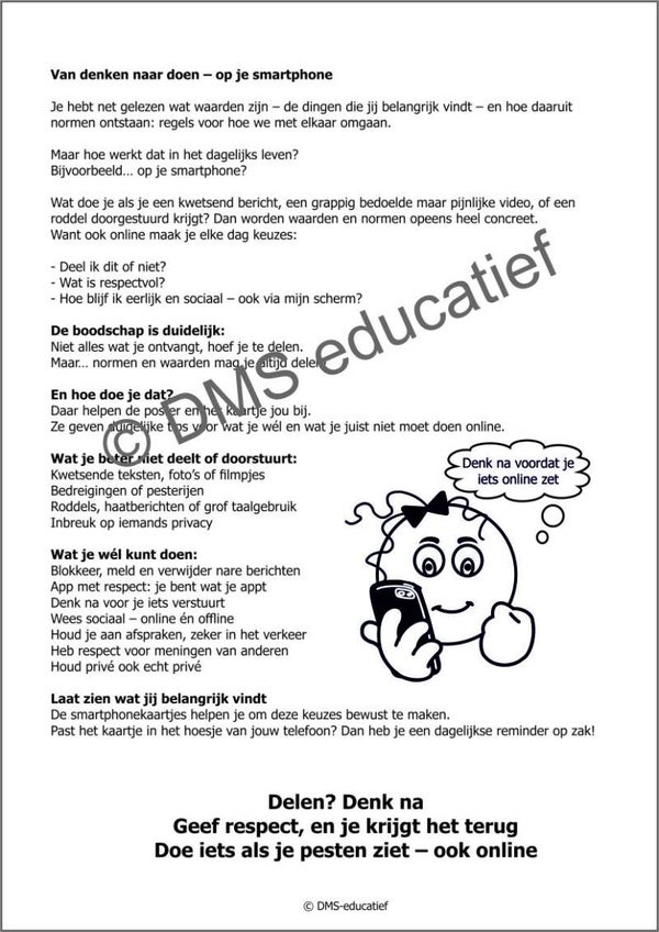 De werkbladen (4x A4-formaat) sluiten aan bij de themabox ‘Normen en waarden mag je altijd delen’ en bevat korte opdrachten, voorbeelden en vragen die helpen om op een toegankelijke manier te praten over goed samenleven en digitaal respect.